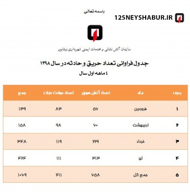 ایشان در ادامه گفت : برابر آمار ستاد فرماندهی آتش نشانی تا پایان تیر ماه آتش نشانان نیشابور به 1069 مورد عملیات اطفای حریق و حوادث منجر به نجات اعزام شده اند که از این میان 658 مورد آتش سوزی و 411 مورد حوادث منجر به نجات بوده است که در سال 97 این تعداد در مدت مشابه 607 مورد بوده است .