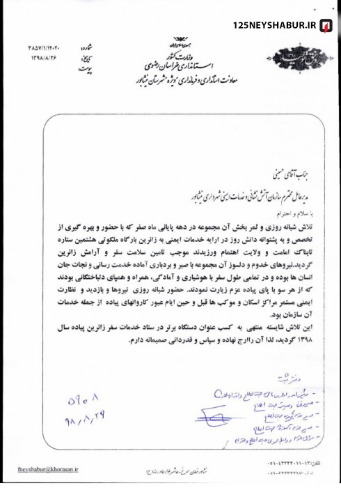 آتش نشانی نیشابور به عنوان دستگاه برترستاد خدمات سفر زائران پیاده امام رضا (ع) شناخته شد .