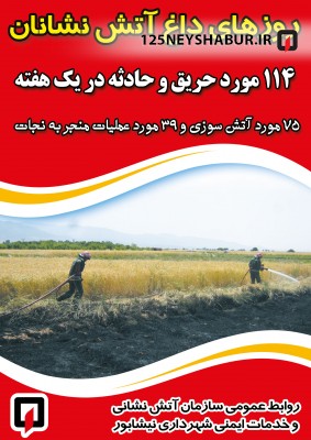 به گزارش روابط عمومی سازمان آتش نشانی و خدمات ایمنی شهرداری نیشابور ، با گرم شدن هوا تعداد حریق و حادثه افزایش چشمگیری داشته است به طوری که در هر روز بیش از 20 مورد حریق و حادثه به سامانه 125 اعلام می شود .