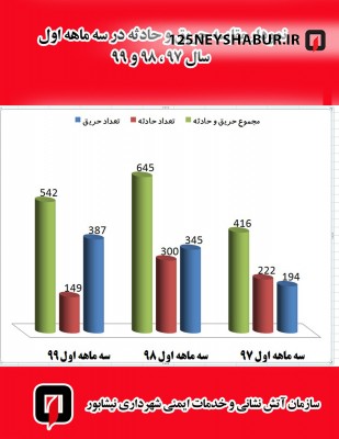 نمودار مقایسه حریق و حادثه در سه ماهه اول سال 97 ، 98 و 99