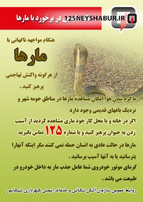 آتش نشانان آموزش کافی برای مواجهه با این حیوانات را دیده اند و سعی می کنند بدون آسیب رساندن به حیوان ، آنرا گرفته و در طبیعت رها سازی کنند . البته توجه داشته باشید که مارها در یک جا نمی مانند پس به محض دیدن آنها با سامانه 125 تماس بگیرید و تا رسیدن آتش نشانان مراقب جابجا شدن حیوان باشید .