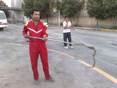 یک مار افعی در کارخانه آسفالت شهرداری توسط نجاتگران آتش نشان به صورت زنده گرفته شد . این مار که بیش از یک متر طول داشت در زیر دستگاه سرند کارخانه آسفالت شهرداری بود.