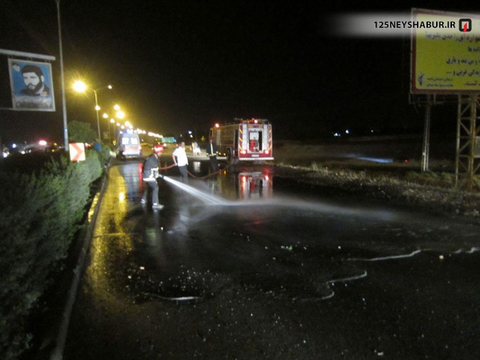 بعد از عملیات نجات آتش نشانان با شستن سریع کف جاده و باز کردن جاده از بروز خطرات احتمالی پیشگیری کردند .