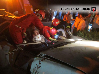این حادثه که در محور بلوار 76 متری امام رضا رخ داده بود در ساعت 22:7 دقیقه به ستاد فرماندهی آتش نشانی نیشابور اعلام شد 2 مصدوم داشت که بلافاصله یک تیم نجات از ایستگاه یک و یک تیم از آتش نشانان ایستگاه 5 به محل اعزام شدند . آتش نشانان برای جلوگیری از حوادث احتمالی دیگر ابتدا اقدام به نصب علائم هشدار دهنده نمودند و سپس تیم نجات عملیات ثابت سازی و راهاسازی راننده را آغاز کرد و تیم آتش نشان نیز عملیات احتیاط حریق را انجام دادند . راننده پراید بعد از برخورد باتیر چراغ برق وسط اتوبان در داخل ماشین گیر کرده بود و از ناحیه پا نیز دچار اسیب دیدگی شدید شده بود که توسط نجاتگران آتش نشان عملیات رها سازی وی با برش سقف خودرو انجام شد . پس از رها سازی مصدوم توسط امدادگران اورژانس 115 به بیمارستان انتقال یافت . سرنشین دیگر این خودرو نیز از ناحیه دست دچار آسیب شده بود که وی نیز به بیمارستان اعزام شد .