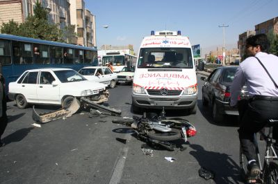 تصادف یک دستگاه خودرو سواری پیکان با موتور سیکلت در خیابان ١۵ خرداد باعث آسیب دیدن راکب موتور سیکلت و گیر کردن پای وی در داخل چرخ عقب شد .