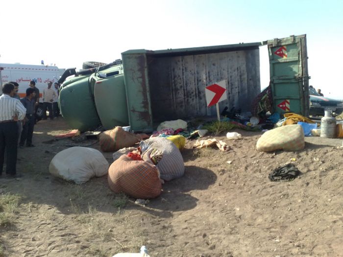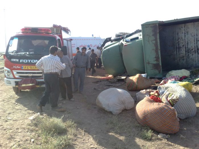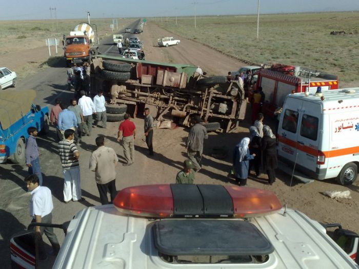 یک کامیون کمپرسی که حدود ۴٠ نفر مسافر سوار کرده و برای زیارت عازم کاشمر بود در کیلومتر ١٠ جاده کاشمر در سر یک پیچ واژگون شد و