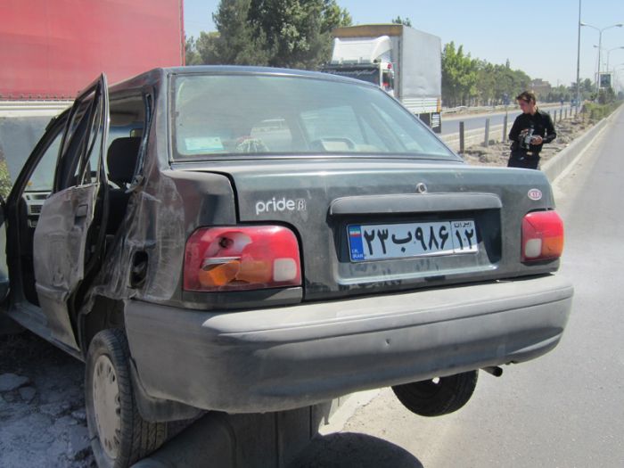 این حادثه در بلوار 76 متری مقابل فرمانداری در محور رفت به سمت سبزوار رخ داد . بر اثر برخورد دربهای سمت راننده ، بدنه ، گلگیر ، صندوق عقب ، لاستیک ها و رینگهای خودرو آسیب دید .