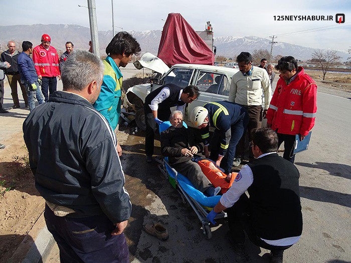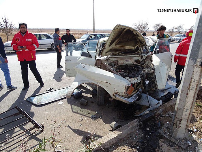 خودرو پیکانی که در مسیر بلوار شهید شوشتری (جاده باغرود نیشابور) در حرکت بود به شدت با تیر چراغ برق برخورد نمود .