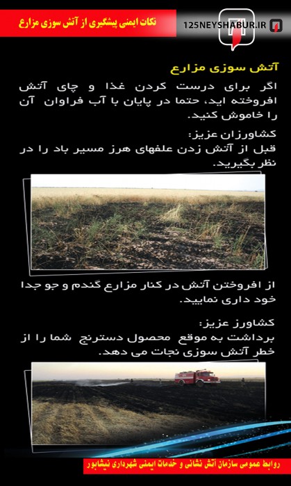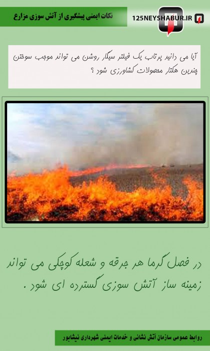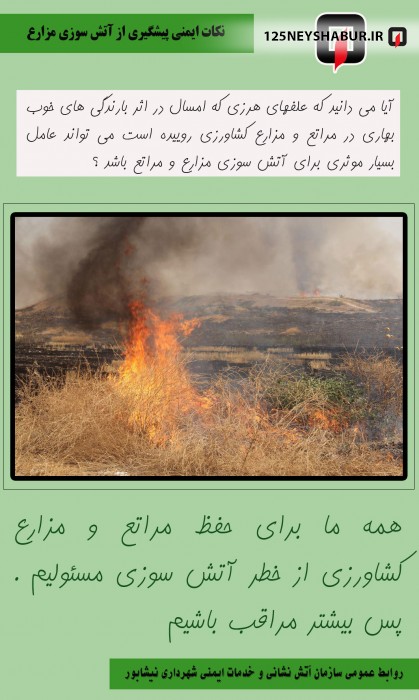 با توجه به بارندگی هایی که در بهار امسال داشته ایم و نظر به تجربه سال های گذشته ، در فصل بهار و تابستان امسال انتظار می رود که به دلیل رویش علف های هرز آتش سوزی علفزارها و مزارع کشاورزی افزایش یابد .