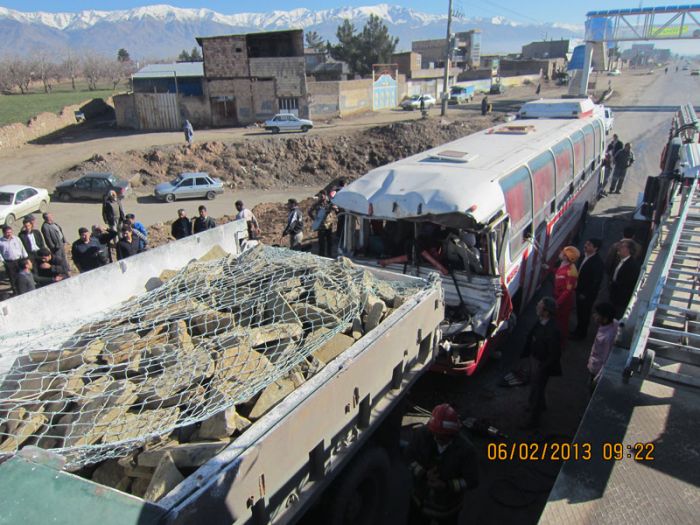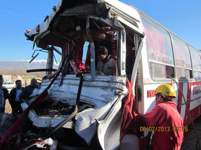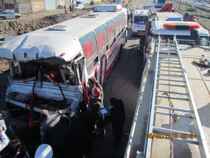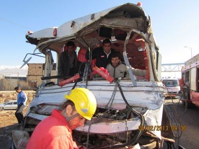 در این تصادف خودرو اتوبوس از عقب با یک کامیون حامل سنگ برخورد نمود . با اعلام این حادثه دو تیم از نجاتگران و آتش نشانان به محل اعزام شدند . با توجه به اینکه پلیس راه عملیات ایمن سازی جاده را انجام داده بود نجاتگران برای رهاسازی راننده اتوبوس که در پشت فرمان گیر افتاده بود اقدام کردند . آتش نشانان با استفاده از ست هیدرولیک توانستند مصدوم را از پشت فرمان رها ساخته و تحویل امدادگران اورژانس بدهند .