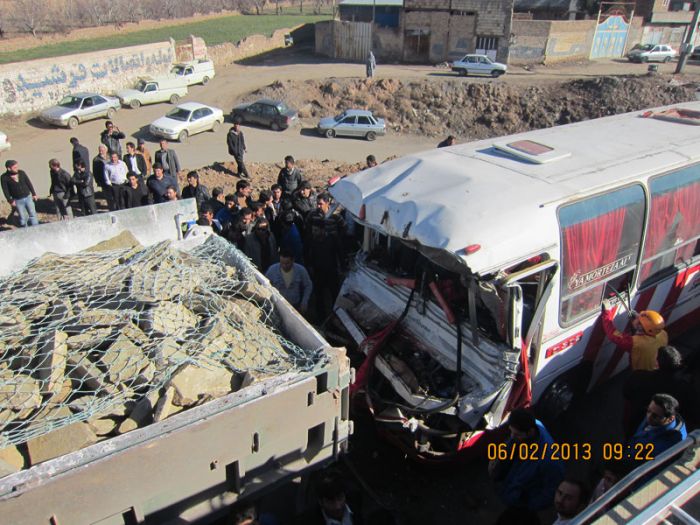 یک اتوبوس مسافربری با یک دستگاه کامیون در محور مشهد نیشابور تصادف کرد .