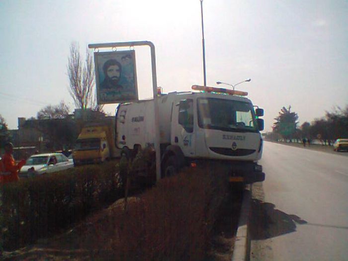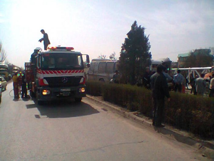یک اتوبوس مسافربری در بلوار ٧۶ متری با یک دستگاه کامیون تصادف نمود .