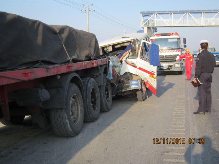 حادثه زمانی رخ داد که مینی بوس حامل مسافر به علت بی احتیاطی راننده از عقب به تریلر در حال حرکت برخورد کرد . قسمت کفی تریلر تا صندلی دوم وارد اتاق مینی بوس شد و باعث گیر کردن سه نفر در لابلای صندلی ها و فرمان شد . نجاتگران آتش نشان برای آزاد سازی مصدومین ابتدا با استفاده از جکهای تلسکوپی ایمنی مصدومین را در محلی که گیر کرده بودند ایجاد کردند تا باعث وارد شدن جراحات بیشتر نشود . سپس با برش صندلی و فرمان به وسیله ی دستگاه هیدرولیکی مصدومان را خارج نمودند.