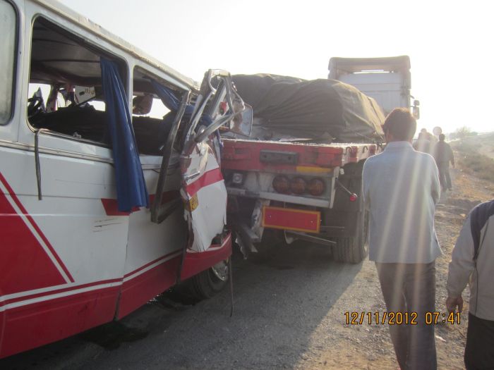 بی احتیاطی راننده مینی بوس باعث تصادف آن با تریلر شد . این تصادف در محور مشهد - نیشابور در مقابل روستای حاجی آباد رخ داد .