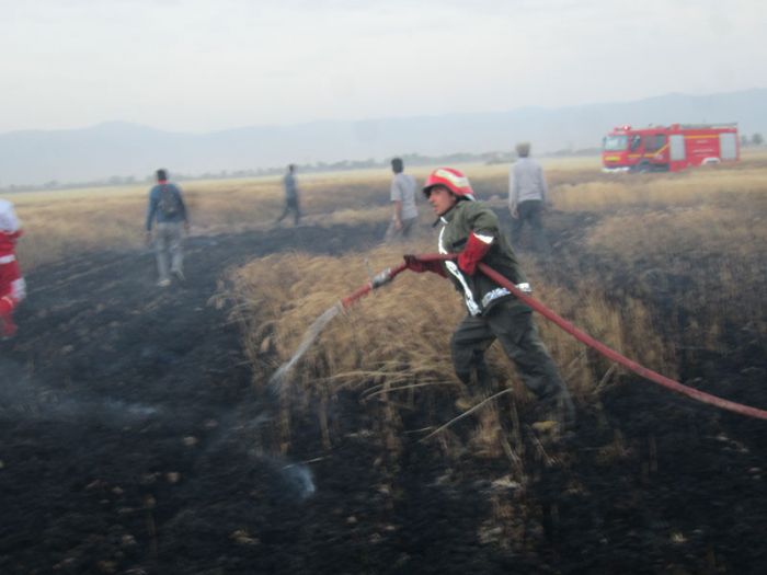 شعله های آتش خوشه های طلایی یک مزرعه گندم را به کام خود کشید .