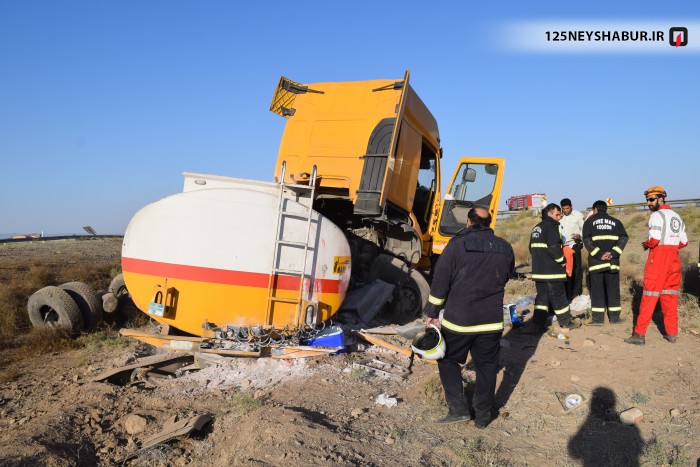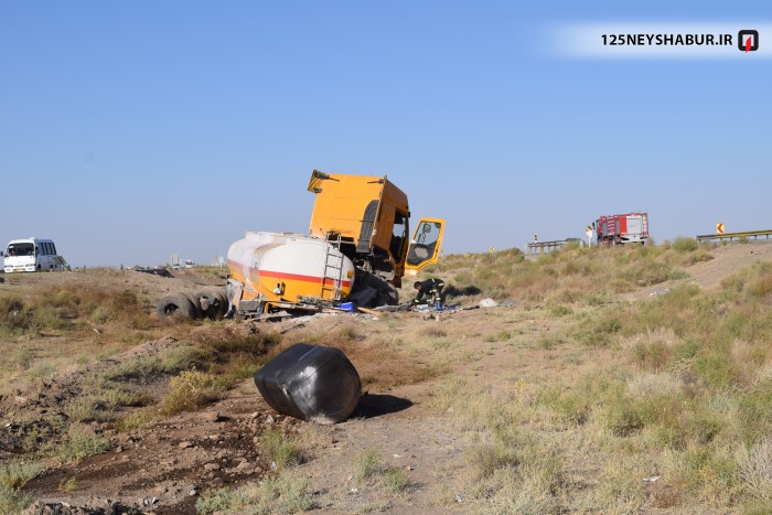 یک تریلر تانکر حامل ٣۵ هزار لیتر بنزین سوخت هواپیما در ٣٢ کیلومتری نیشابور از جاده خارج شد .